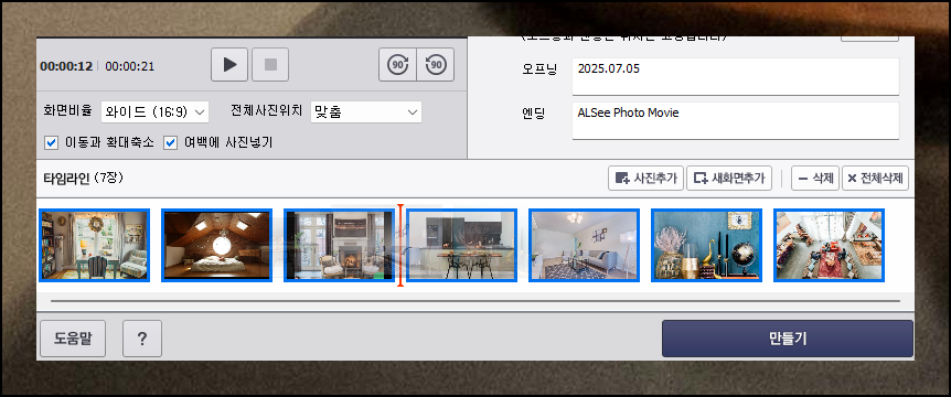 간편만들기 기능을 활용하면 신속하게 동영상 만드는 것이 가능해요. 원하는 사진들을 추가하고, 배경음악을 선택하고, 각 이미지의 화면 재생시간을 설정하면 됩니다. 오프닝과 엔딩에 들어갈 문구도 넣을 수 있어요. 더 특별하게 만들고 싶다면 화면 우측 상단의 "상세꾸미기" 버튼을 눌러보세요.
