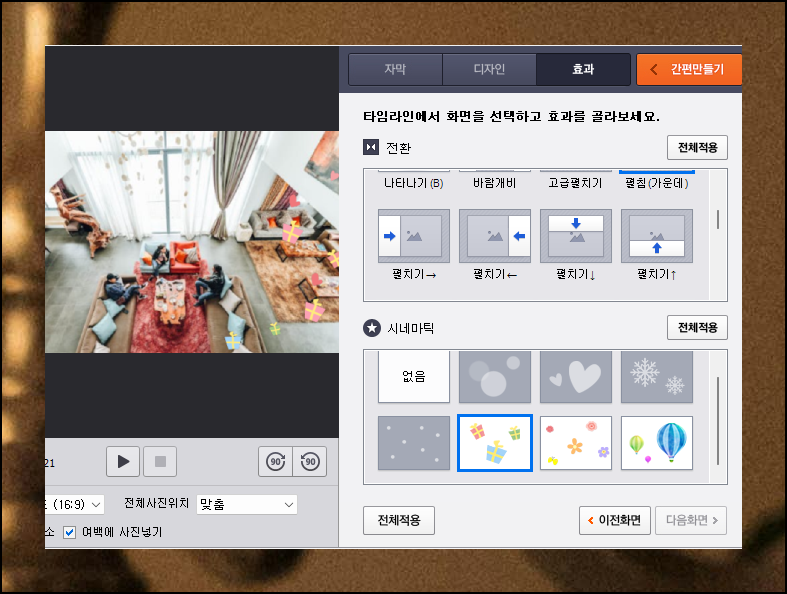 정적인 사진들이 단조롭게 느껴진다면 전환 효과를 추가해 보세요. 간단한 방법으로 동영상에 생동감을 불어넣을 수 있어요. 여러 방향에서 날아오게 하거나 펼치고, 퍼지는 등 정말 다양한 전환 효과를 선택할 수 있습니다. 효과를 하나씩 선택할 때마다 미리보기로 재생해 보세요.