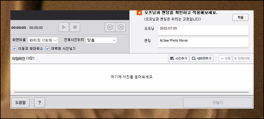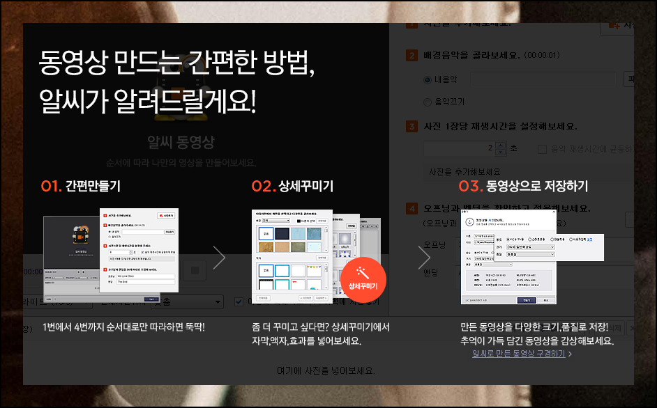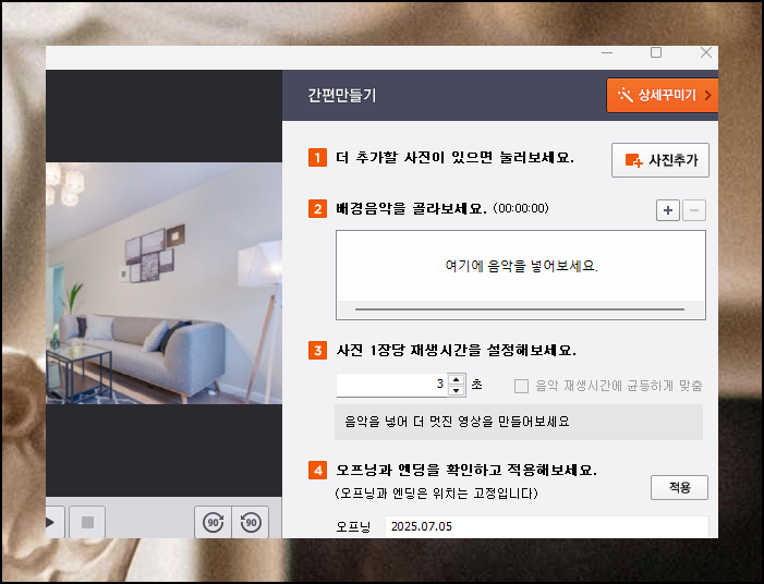 간편만들기 기능을 활용하면 신속하게 동영상 만드는 것이 가능해요. 원하는 사진들을 추가하고, 배경음악을 선택하고, 각 이미지의 화면 재생시간을 설정하면 됩니다. 오프닝과 엔딩에 들어갈 문구도 넣을 수 있어요. 더 특별하게 만들고 싶다면 화면 우측 상단의 "상세꾸미기" 버튼을 눌러보세요.