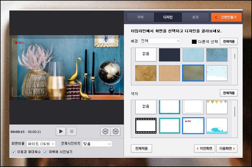 알씨에서는 다양한 디자인 요소들을 미리 준비해 놓았습니다. 배경과 액자 디자인을 추가하는 것도 매우 간단해요. 우리는 마음에 드는 디자인을 선택하기만 하면 되거든요. 하나의 사진에만 적용하거나 전체 이미지에 동일하게 적용할 수 있어요.