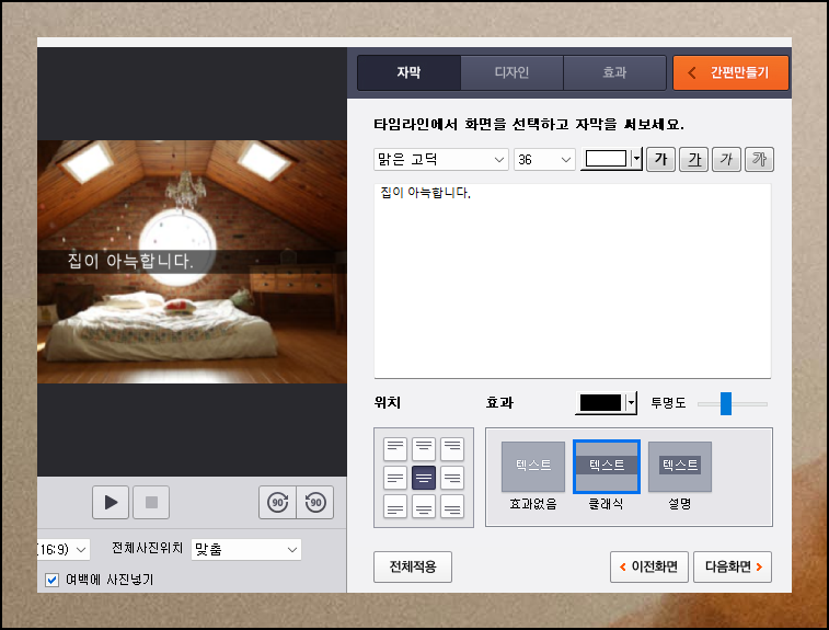 상세 꾸미기 창이 열리면 다양한 옵션들이 나타납니다. 자막, 디자인, 효과를 추가할 수 있는 버튼들이 준비되어 있어요. 특정 화면에 자막을 넣고 싶다면 타임라인에서 해당 이미지를 먼저 선택해야 합니다. 그 다음 자막으로 사용할 텍스트를 입력하고, 위치와 효과, 투명도를 지정해 주세요.