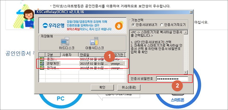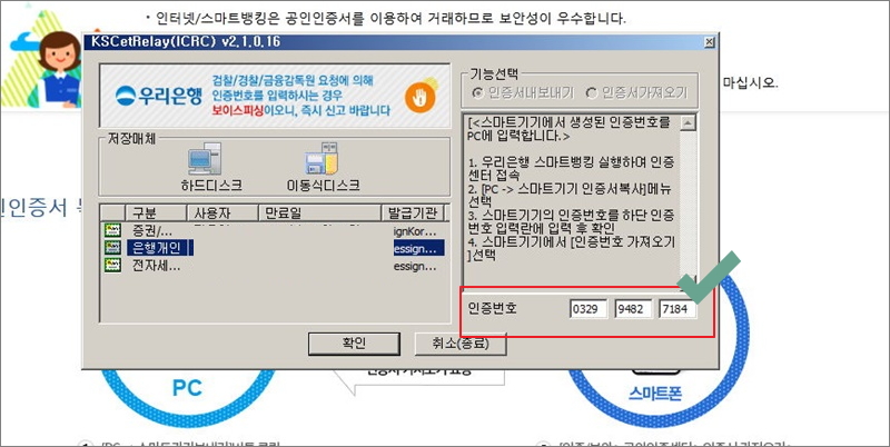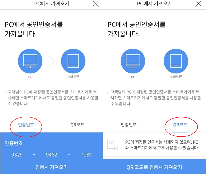 ▼ PC에서 스마트폰으로 공인인증서를 전달하는 화면이 나타났습니다. 인증번호와 QR코드 2가지 방식으로 인증서를 전달할 수 있습니다.