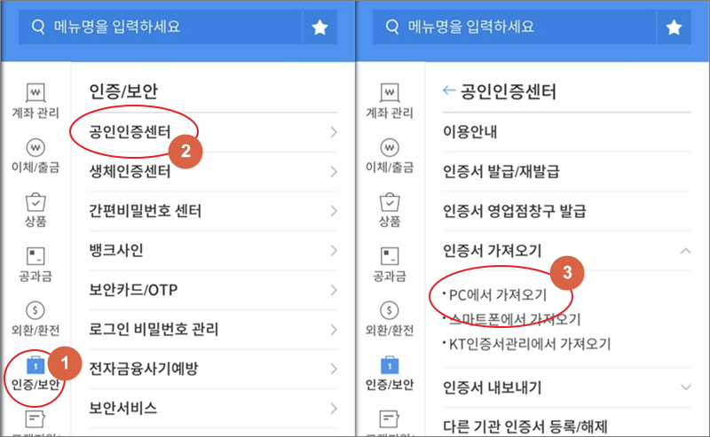 ▼ 제 경우에는 우리은행 어플을 설치했습니다. 어떤 은행 어플이던 휴대폰에 공인인증서를 등록하는 방법은 비슷비슷합니다. 어플이 실행되면 "전체 메뉴"로 들어갑니다. 그럼 "인증/보안" 카테고리에 있는 "공인인증센터"를 찾을 수 있습니다. 이곳에서 "PC에서 가져오기"를 선택하면 인증서를 휴대폰에 등록하는 서비스를 이용할 수 있습니다.