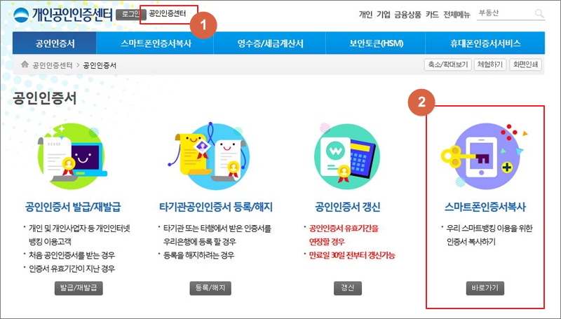 ▼ 은행 사이트에 접속하면 메인화면 상단에 "공인인증센터"가 있습니다. 해당 메뉴를 클릭하면 공인인증서 관련 서비스가 여러 가지 나타납니다. 여기서 4번째에 위치한 "스마트폰 인증서 복사" 서비스를 선택합니다.