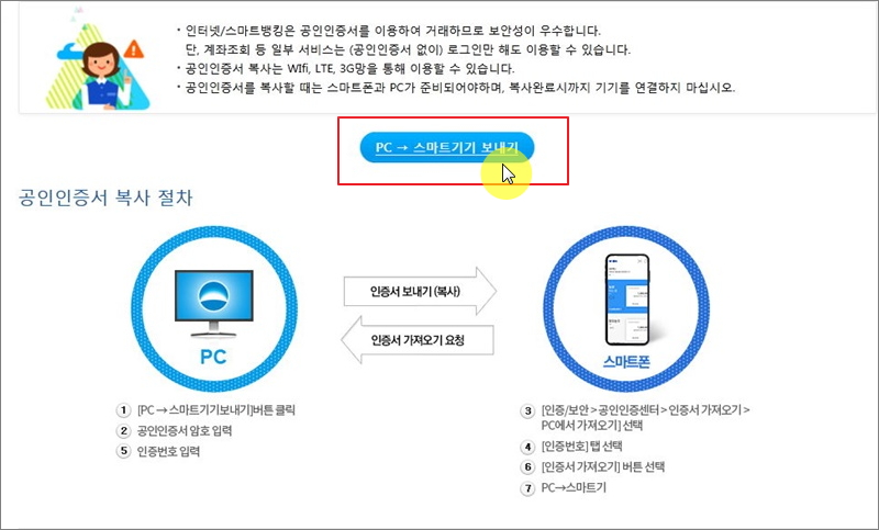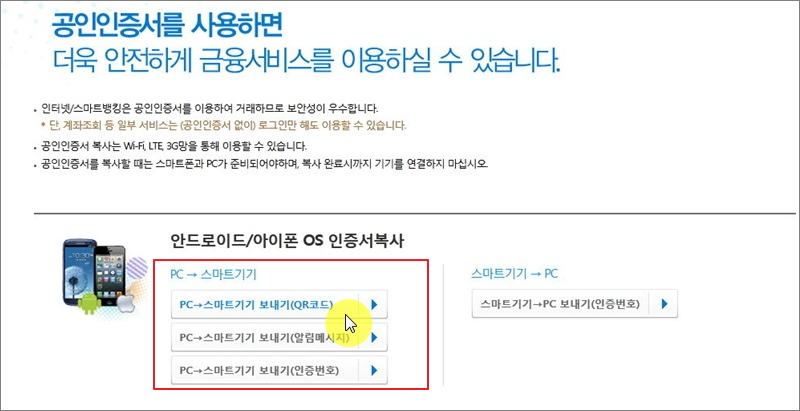 ▼ 새롭게 열린 페이지에서 공인인증서를 등록하고자 하는 기기의 종류나 인증서 전달 방식에 따라 메뉴를 선택합니다. 인증번호 방식이 개인적으로 가장 편했습니다.