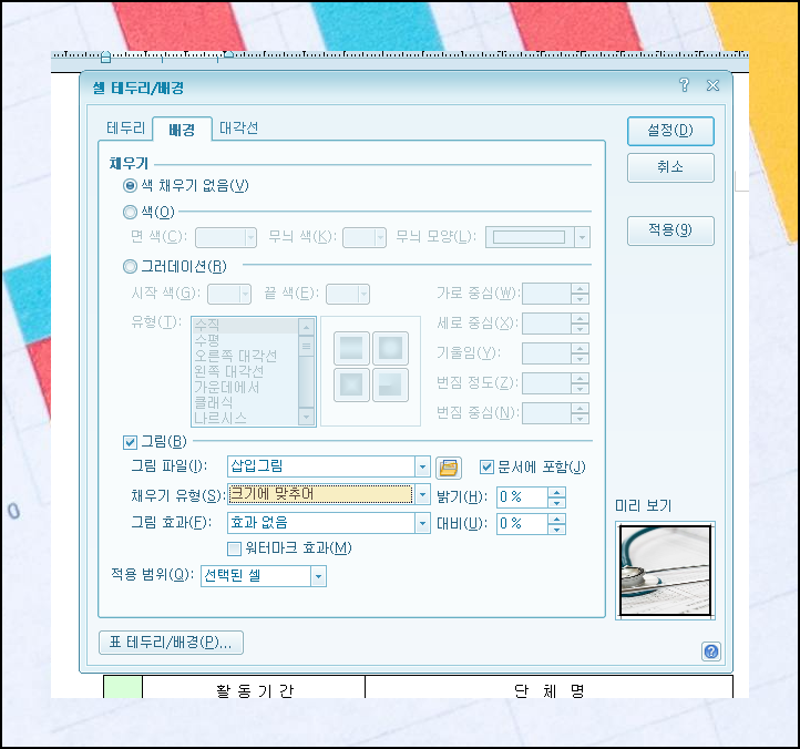이전 단계를 정확히 따라했다면 "셀 테두리/배경" 설정 창이 열려있을 거예요. 배경 탭을 선택한 다음 채우기 옵션에서 그림을 체크해주세요. 그림 파일 선택은 삽입 그림을 클릭하고 파일 탐색기를 통해 원하는 이력서에 넣을 이미지 파일을 찾아 선택해주세요. 채우기 유형에서는 "크기에 맞추어"를 선택하고 설정 버튼을 눌러 완료합니다.