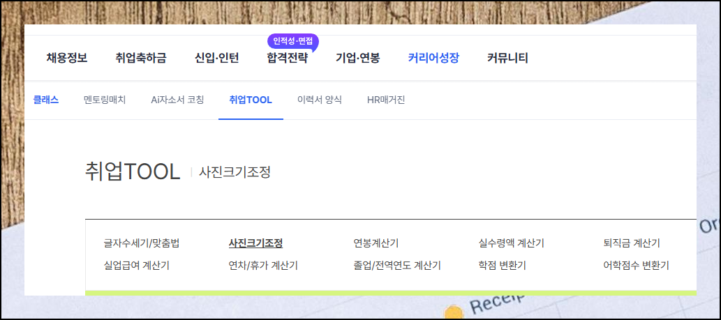 커리어 성장 페이지에 들어오셨나요. 이곳에서는 이력서에 넣을 이미지의 크기 조정 프로그램뿐만 아니라 구직 활동에 도움이 되는 다양한 도구들을 제공하고 있어요. 맞춤법 검사기, 글자수 카운터, 연봉 계산기 등이 있습니다. 이력서 사진 크기를 바꾸려면 취업 TOOL 카테고리에서 "사진 크기 조정" 메뉴를 선택해주세요.