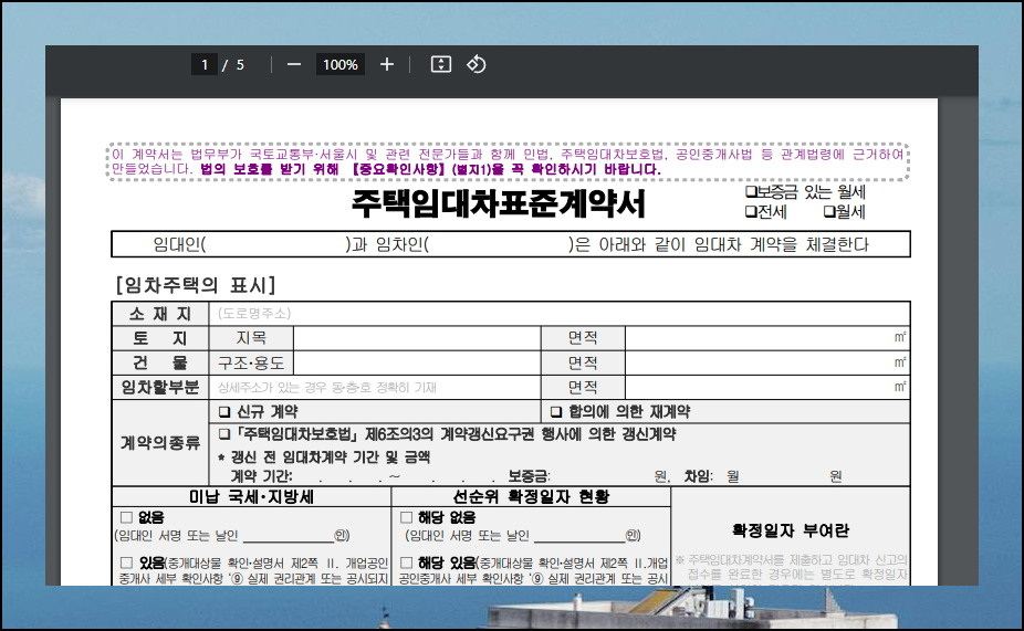 무료 제공되는 표준 서식으로 보증금이 포함된 월세부터 전세, 순수 월세까지 모든 유형의 임대차가 가능합니다. 계약서 작성 시작부터 만료까지 전체 과정에 대한 상세 안내서가 함께 제공되어요.