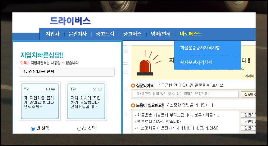 본격적인 무료풀이를 위해 온라인 사이트를 활용해보겠습니다. 드라이버스라는 곳에 접속하시면 되는데요. 여기서는 누구든지 무료로 택시운전 자격시험 기출문제를 풀어볼 수 있어요. 사이트에 들어가서 바로테스트 메뉴를 찾아 클릭해보세요. 그러면 하위 메뉴에 택시운전 항목이 보일 거예요.