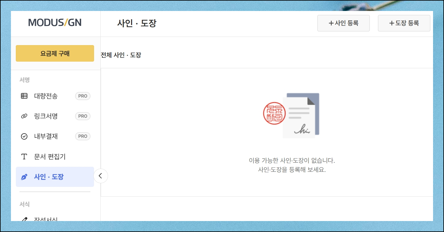 전자계약 플랫폼인 모두싸인에 먼저 로그인해야 해요. 무료 프로그램을 이용하기 위해서는 회원가입이 필요하지만 걱정하지 마세요. 가입 과정이 매우 간소화되어 있어서 단 10초면 완료할 수 있어요. 참고로 컴퓨터로 무료도장 만들기 진행을 할 때에 어떤 비용도 발생하지 않습니다.