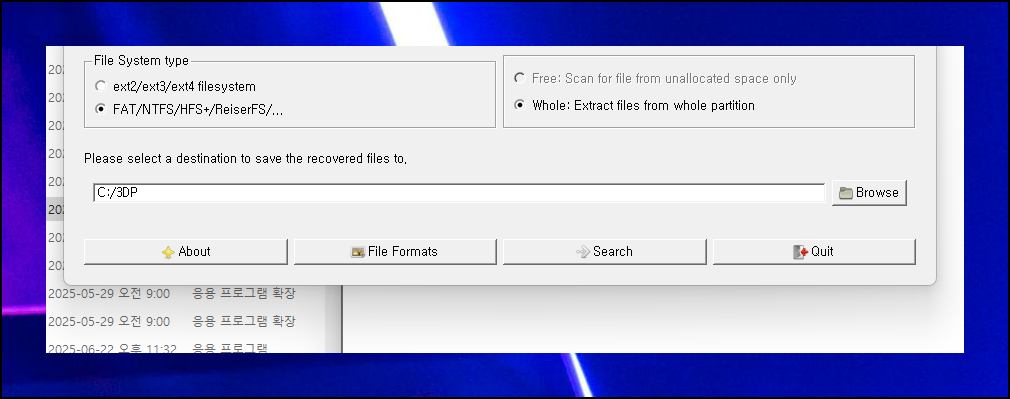 하단 오른쪽을 보면 BROWSE 버튼이 있어요. 이 버튼을 눌러서 되살리고 싶은 사진 파일들이 저장될 폴더를 미리 정해두세요. SEARCH 버튼을 클릭하면 스캔 작업이 시작되고, 우리가 설정한 폴더에 삭제되었던 사진들이 나타날 거예요.