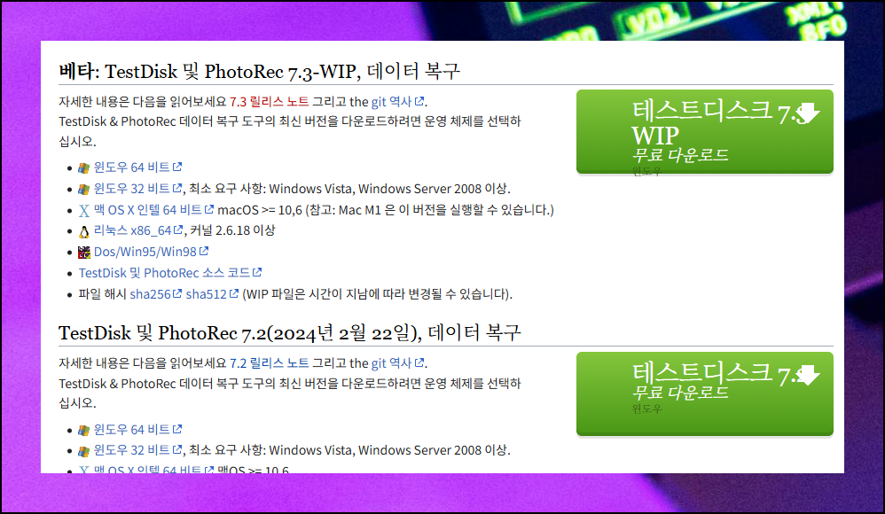 제작사 사이트에서 좌측 DOWNLOAD 메뉴를 확인해 보세요. 이 메뉴를 통해서 최신 버전으로 사진 복구 프로그램인 TESTDISK를 다운받을 수 있어요.