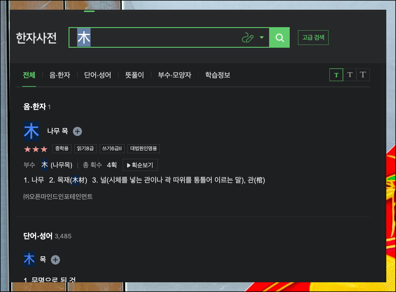첫 화면에서 부수와 총획수를 바로 볼 수 있어요. 전통 옥편과 마찬가지로 핵심 정보가 체계적으로 구성되어 있습니다. 하단에는 다양한 의미들이 제시되는데요. 평소 알던 뜻보다 풍부한 의미를 지니고 있다는 점을 발견하게 될 거예요.