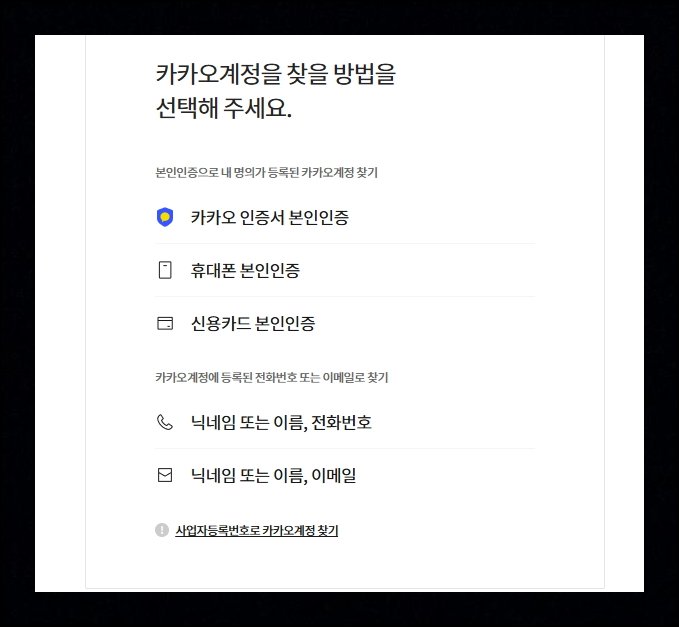 시스템 안내에 따라 카카오 인증서, 휴대폰 번호, 닉네임을 통해 계정 검색이 가능합니다. 로그인 정보를 되찾은 후에는 앞서 안내한 조회 방법을 따라하면 돼요. 여러 인증 방식이 마련되어 있으니 편한 방법을 선택해서 진행하세요.