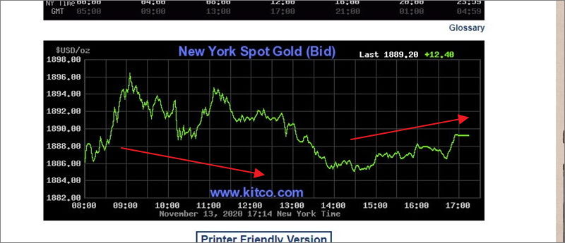 ▼ New York Spot Gold (Bid) 실시간 차트도 있습니다. 국제 금시세의 흐름을 보면 오전 중에 급하게 올랐다가 점심부터 완만하게 하락하는 하는 모습을 보이고 있습니다. 오후 2시 이후에는 조금씩 상승하고 있는데, 추이를 지켜보아야 제대로 알 수 있을 것 같습니다.