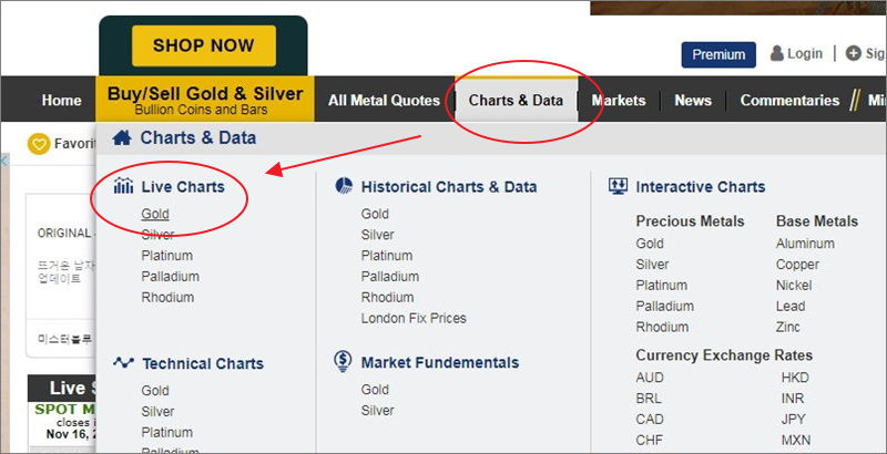 ▼ kitco 사이트에 접속했습니다. 해외 사이트이기 때문에 영어로 되어 있습니다. 하지만 영어를 몰라도 해당 사이트를 통해 실시간 금시세를 조회할 수 있습니다. 메뉴에서 "Chart & Data"를 클릭한 후 "Live Charts" 카테고리에 있는 "Gold"를 클릭합니다.