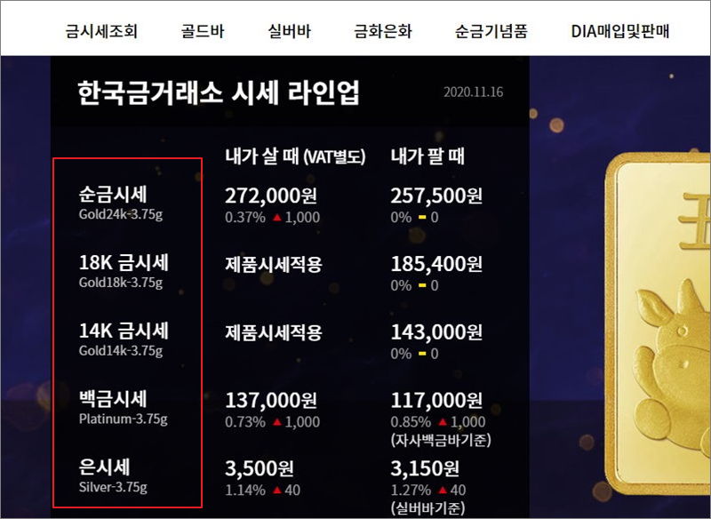 ▼ 여기서도 실시간에 가깝게 매일 금시세가 업데이트 되고 있습니다. 순금은 물론이고, 18k, 14k, 백금, 은에 대한 시세도 확인이 가능합니다. 내가 살 때와 팔 때의 가격 차이가 있으니 이러한 부분도 참고하시길 바랍니다.