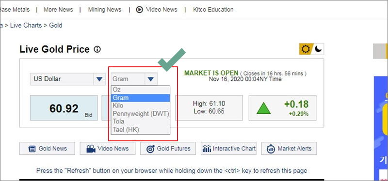 ▼ 기본적으로는 국제 금시세를 알아볼 때 사용되는 달러와 온스로 지정이 되어 있습니다. 원화로 변경하는 것은 안되기 때문에 중량 단위만 변경해 보겠습니다. Gram, Kilo, Tola, Tael, Pennyweight로 변경할 수 있습니다. 실시간 금시세 아래를 보면 금 관련 뉴스, 예측치, 차트, 금시세 알림 서비스를 이용할 수 있는 메뉴가 있으니 참고하시길 바랍니다.