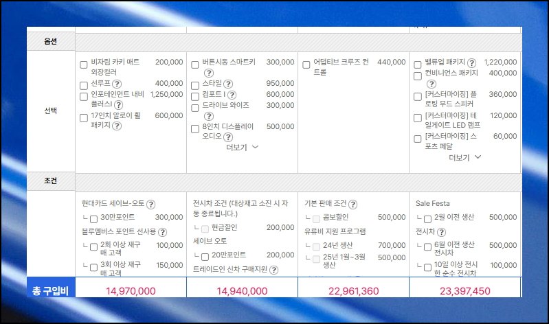 정확한 계산을 위해 이제 옵션과 특별 혜택을 설정해 보겠어요. 옵션은 차량 출고 후에는 변경이 거의 불가능하니까 신중하게 선택하시길 바라요.
