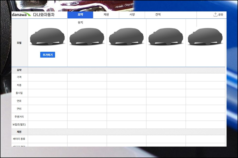 사이트에서 자동차 가격비교 페이지에 들어가면 제일 먼저 해야 할 작업이 있어요. 알아보고 싶은 차량들을 목록에 추가하는 겁니다. 최대 5개까지 선택할 수 있고 추가하기 버튼만 누르면 돼요.