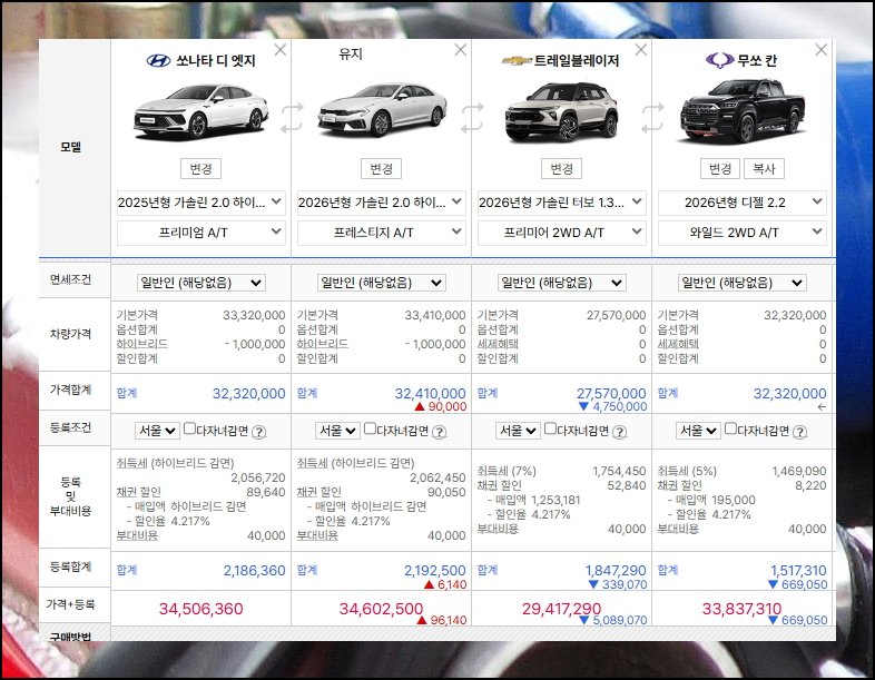 국산차 몇 개 모델을 선택하면 즉시 요약 정보가 화면에 표시돼요. 가격뿐만 아니라 차종과 출시 연도, 연료 형태까지 한 번에 따져볼 수 있습니다. 여기서 보이는 금액은 기본 사양 기준이라는 점을 명심하세요.