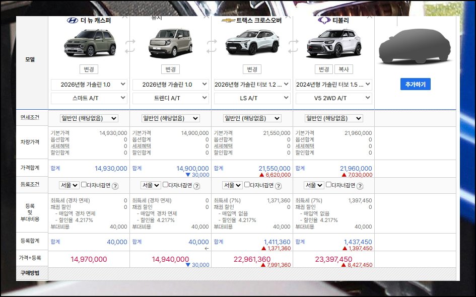 한 곳에서 여러 차종의 정보를 한눈에 볼 수 있어서 정말 편리합니다. 자동차에 대한 전문 지식이 없어도 누구나 쉽게 활용할 수 있고, 원하는 조건에 맞는 최적의 선택을 할 수 있어요. 지금부터 가격비교 사이트에 대한 사용법을 단계별로 안내해드릴 테니 천천히 따라해 보세요. 5대를 동시에 살펴보는 것도 가능합니다.