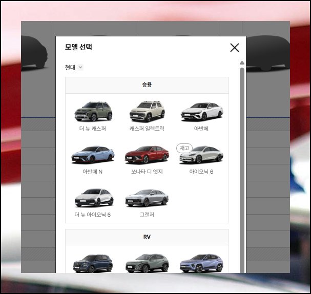 브랜드를 선택했다면 이제 세부 모델을 골라야 해요. 예를 들어 현대를 선택하면 캐스퍼부터 아반떼까지 모든 차량이 나타납니다.