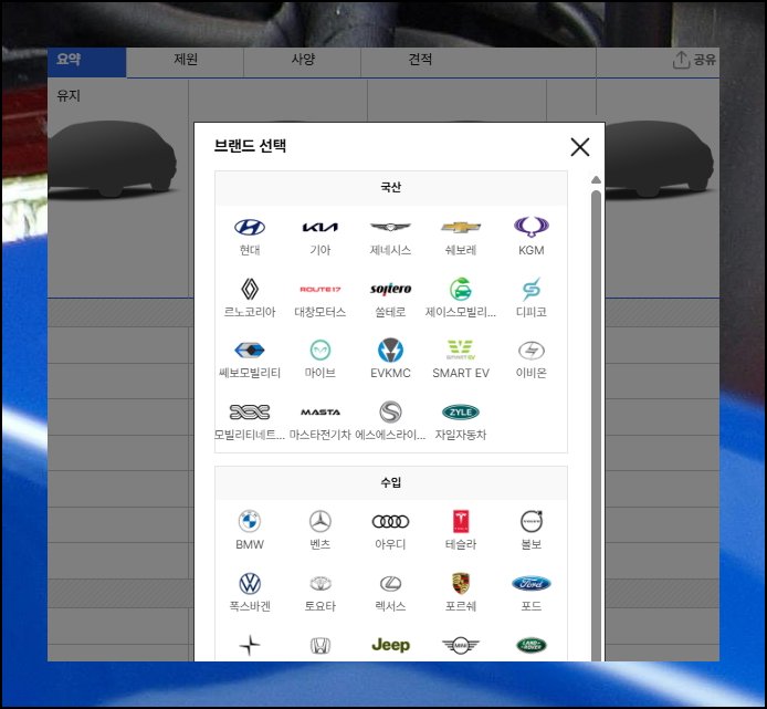 원하는 브랜드를 먼저 정해야 합니다. 현대나 기아, 제네시스 같은 국산 브랜드부터 BMW, 벤츠, 아우디 같은 수입 브랜드까지 다양하게 준비되어 있어요.