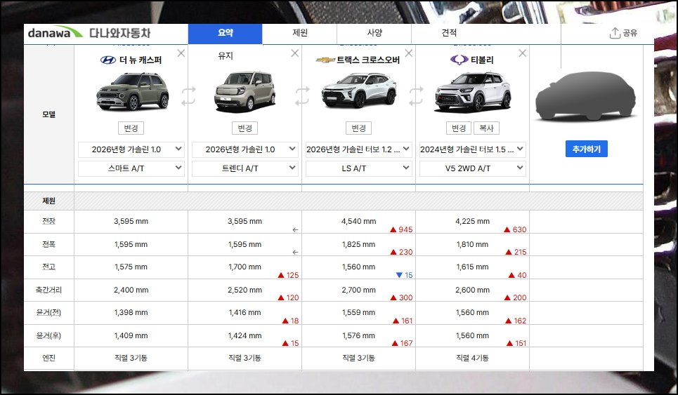 자동차를 사려고 하면 고민이 많죠. 가격도 중요하지만 성능이나 연비도 따져봐야 해요. 한 곳에서 최대 5대까지 동시에 비교할 수 있는 서비스가 있어요. 이런 기능을 제공하는 가격비교 사이트는 흔하지 않습니다. 차량 선택에 필요한 모든 정보를 한 번에 확인할 수 있어서 정말 유용해요.