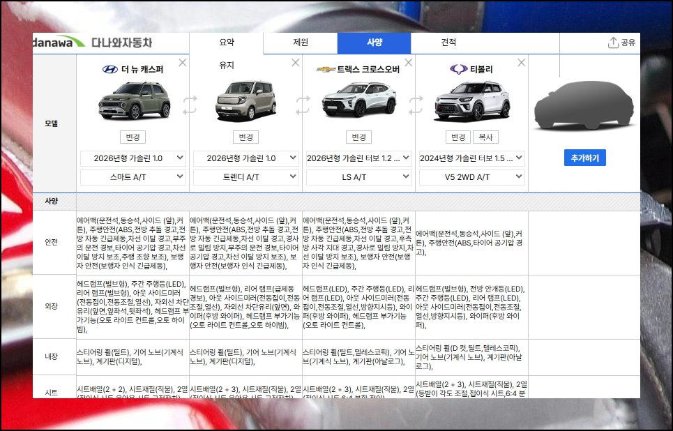 상세한 사양비교도 할 수 있어요. 안전장치부터 외관과 내부 인테리어, 편의기능까지 다양한 분야를 세밀하게 알아볼 수 있습니다.