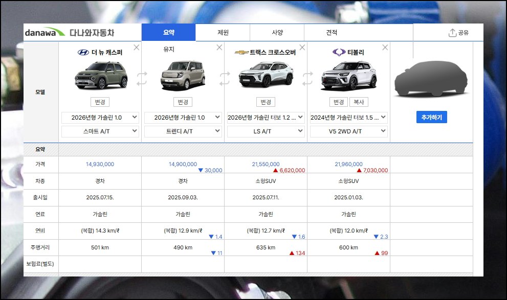 자동차를 사려고 하면 고민이 많죠. 가격도 중요하지만 성능이나 연비도 따져봐야 해요. 한 곳에서 최대 5대까지 동시에 비교할 수 있는 서비스가 있어요. 이런 기능을 제공하는 가격비교 사이트는 흔하지 않습니다. 차량 선택에 필요한 모든 정보를 한 번에 확인할 수 있어서 정말 유용해요.