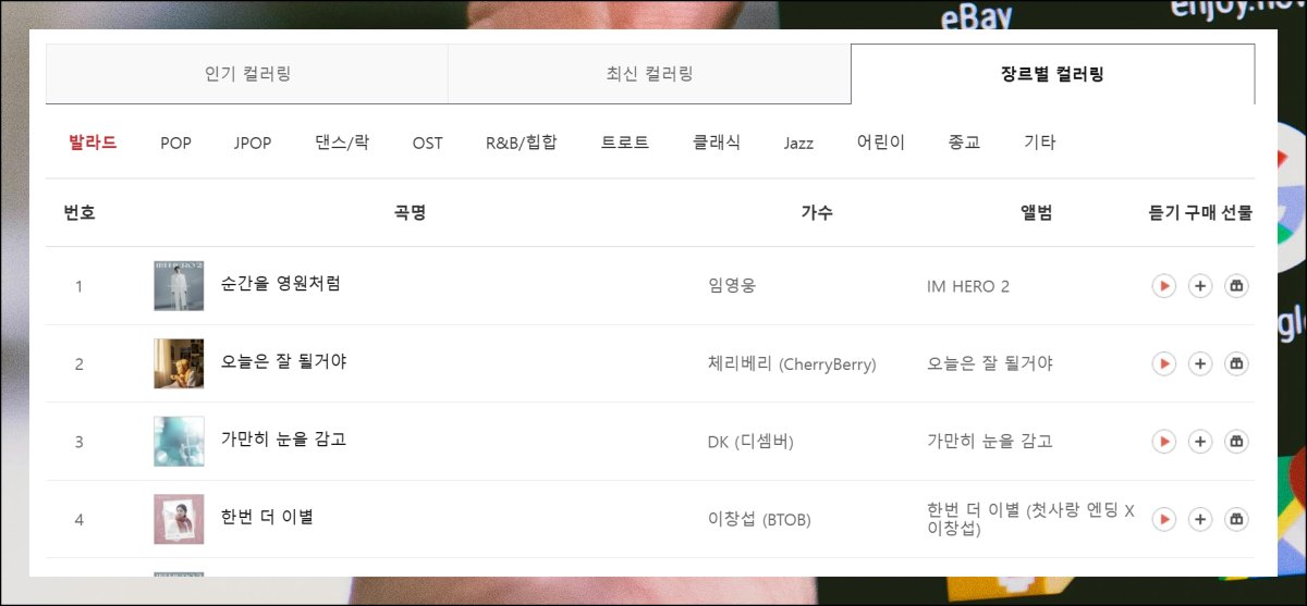 SK텔레콤 웹사이트에서는 정말 폭넓은 장르의 음악을 제공하고 있어요. 발라드, 팝, 일본 팝, 댄스, 락, OST, R&B, 힙합은 물론이고 트로트, 클래식, 재즈, 어린이 음악까지 포함되어 있습니다. 각 장르마다 인기곡 순위를 별도로 정리해놓아서 취향에 맞는 음악을 쉽게 찾을 수 있어요. 원하는 곡을 발견하면 바로 컬러링으로 설정할 수 있어서 편리합니다.