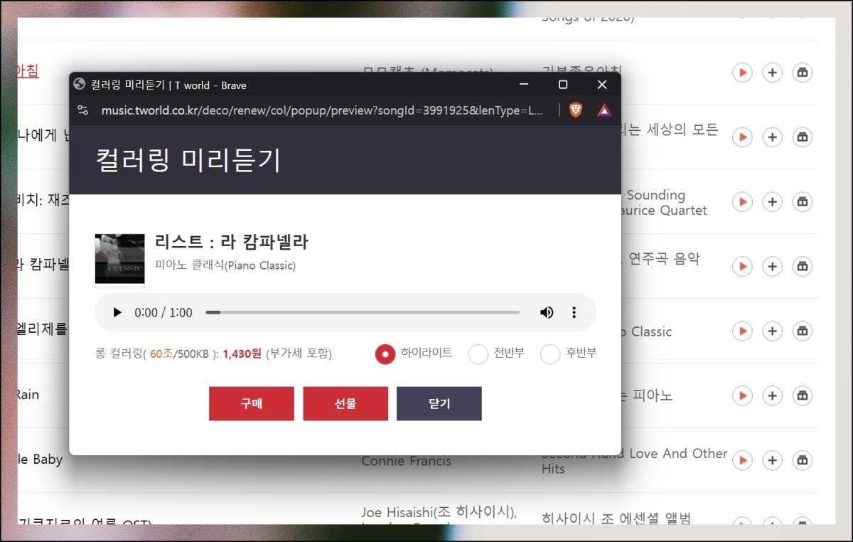 재생 버튼을 클릭하면 음원 미리듣기 창이 열려요. 롱 버전부터 일반 버전, 하이라이트, 전반부, 후반부까지 총 6가지 옵션으로 음원을 비교 감상할 수 있습니다. 각 버전의 요금 정보도 함께 표시되니까 예산에 따라 적절한 선택이 가능해요.