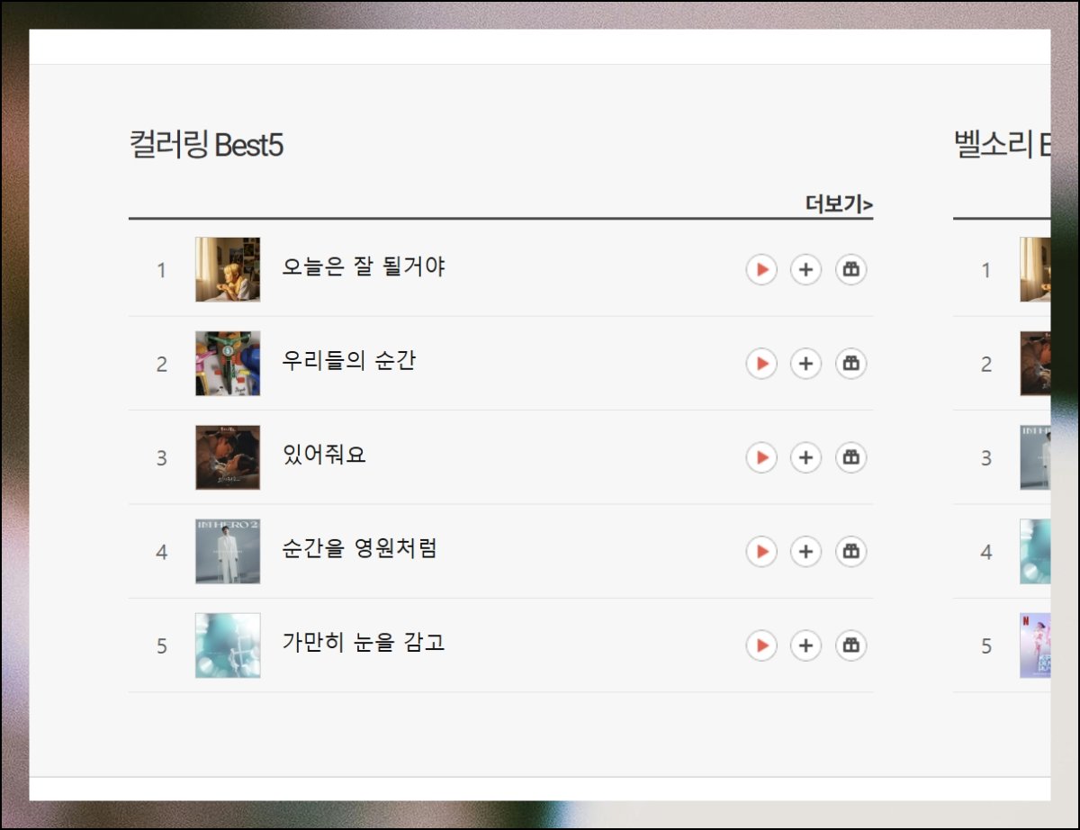 이동통신사들은 보통 최신곡과 인기곡 위주로 음원 목록을 구성해놓고 있어요. SK텔레콤의 컬러링플러스 서비스는 특히 재미있는데요. 개인 음성이나 메시지로 나만의 독특한 컬러링을 만들어볼 수 있거든요. 화면 아래쪽에서는 현재 가장 인기곡 5곡을 바로 확인할 수 있고, 더보기를 누르면 훨씬 많은 선택지가 나타납니다.