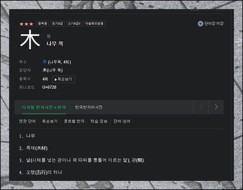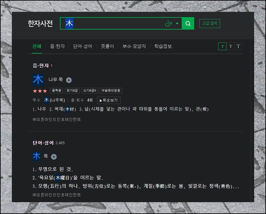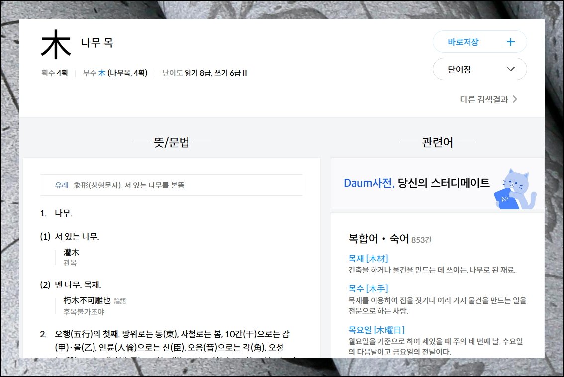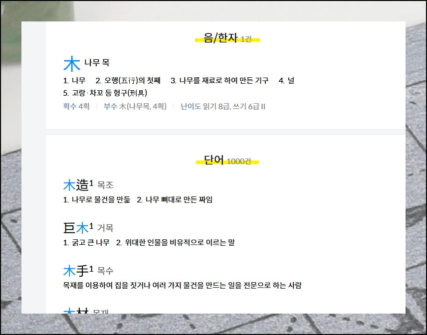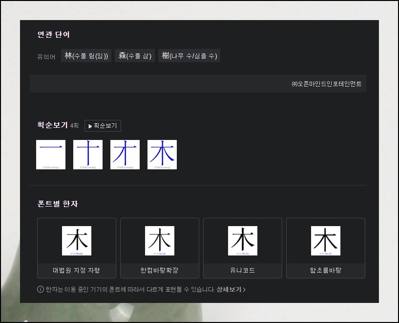 원하는 문자를 입력창에 넣고 버튼을 누르면 결과 화면이 나타나요. 해당 글자에 대한 정보는 물론이고요. 그 문자가 포함된 여러 단어와 표현까지 함께 확인할 수 있습니다. 예를 들어 "나무 목"자를 검색하면 관련 표현이 천 건이 넘게 나와요.