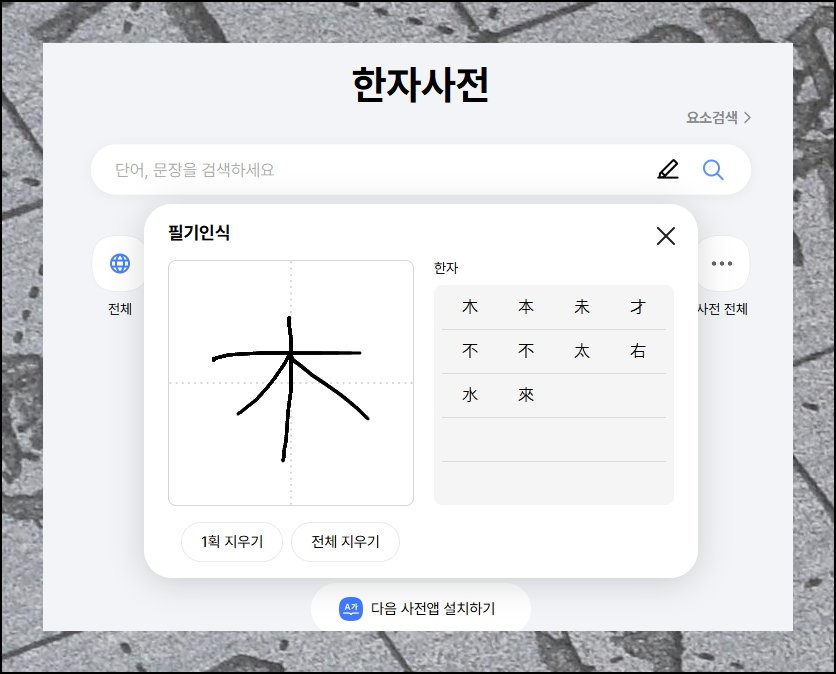 필기 아이콘을 누르면 인식 창이 열려요. 다음에서 제공하는 서비스와 사용 방법이 비슷합니다. 알고 싶은 한자를 화면에 직접 그려보세요. 그린 모양과 유사한 글자들이 자동으로 나타나요.