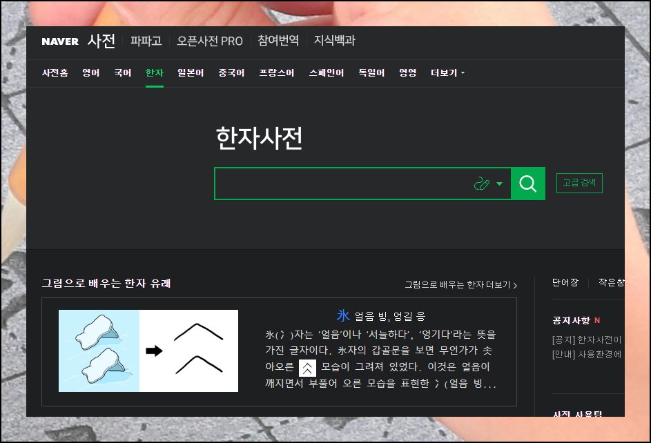 네이버 사전 첫 화면을 보면 한문 공부에 도움되는 여러 도구가 있어요. 한자를 배우고 싶은 분들에게 매우 유익한 자료들이 풍부하게 준비되어 있습니다. 입력창에 있는 필기 모양 아이콘을 클릭해주세요.
