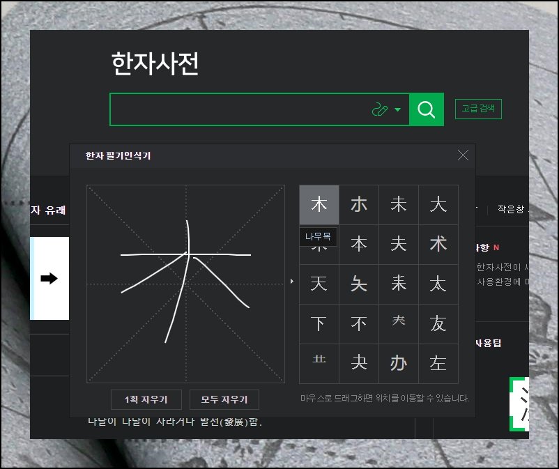 한자를 찾는 가장 쉬운 방법은 필기인식 기능을 활용하는 거예요. 검색창 옆에 배치된 버튼을 눌러보세요. 필기인식 창이 열립니다. 원하는 글자를 마우스로 그려 넣으면 되는데요. 비슷한 모양의 문자들이 오른쪽에 나타나요. 그중에서 원하는 글자를 클릭하기만 하면 검색이 완료됩니다.