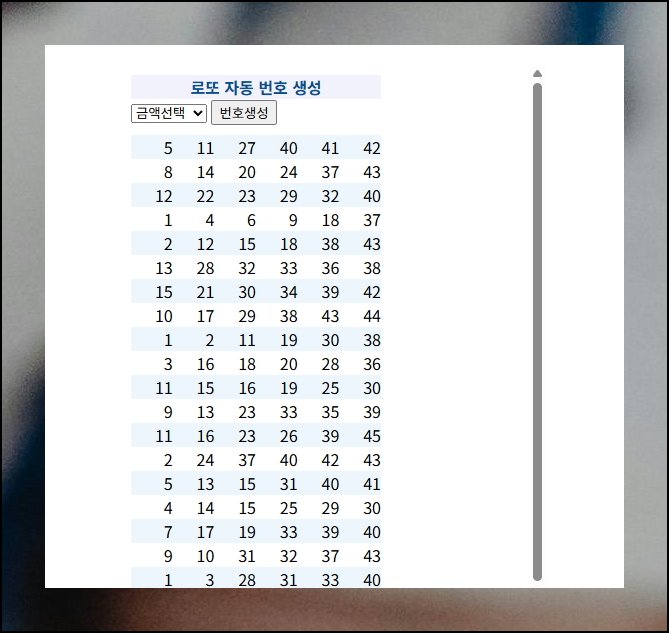 로또번호와 관련한 여러 기능이 한 페이지에 정리돼 있어요. 화면 왼쪽에 있는 메뉴에서 자동번호 옵션을 선택하세요. 자동생성기 프로그램 화면이 나타납니다. 구매하려는 금액을 입력창에 넣고 생성 버튼만 누르면 예상 조합이 즉시 표시됩니다.