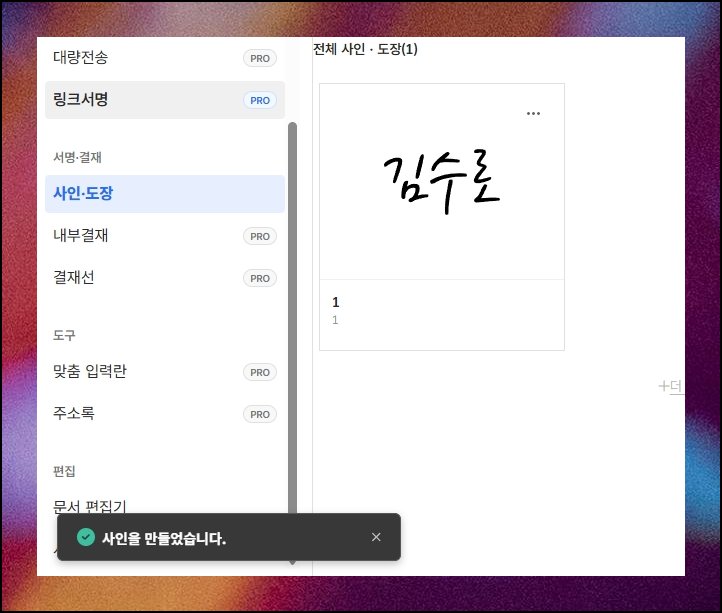 페이지가 전환되면 왼편 탭에서 다섯 번째 사인도장 항목을 선택해 주세요. 레이아웃이 깔끔해서 초보자도 막힘 없이 진행 가능해요. 정보를 기입한 뒤 전자서명 만들기 버튼을 탭하면 그걸로 끝입니다.