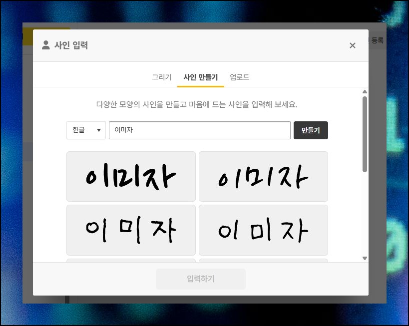 원하는 이름을 타이핑하면 플랫폼이 자체적으로 전자서명 이미지를 생성해 주는 편리한 기능이에요. 나열되는 복수의 시안 중 취향에 맞는 것을 골라내면 됩니다. 무료로 고를 수 있는 디자인이 풍부하니 천천히 비교해 보시길 권합니다.