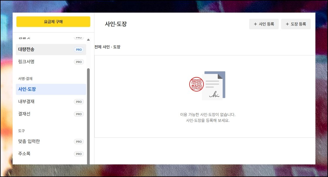 모두싸인이라는 웹 플랫폼을 이용하면 한 푼도 쓰지 않고 전자서명을 제작할 수 있습니다. 평소 전자계약 업무를 많이 처리하시는 분이라면 부가 서비스까지 둘러보시길 추천해요. 포털에서 이름만 검색하면 곧장 접속 가능하니 바로 시작해 보세요.