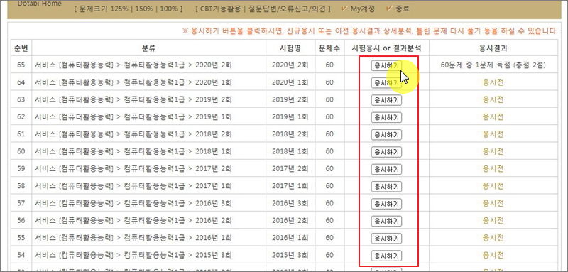 ▼ 새롭게 열린 게시판에서 풀어보고 싶은 컴활1급 시험 회차를 선택합니다. 응시하기 버튼을 누르면 됩니다.