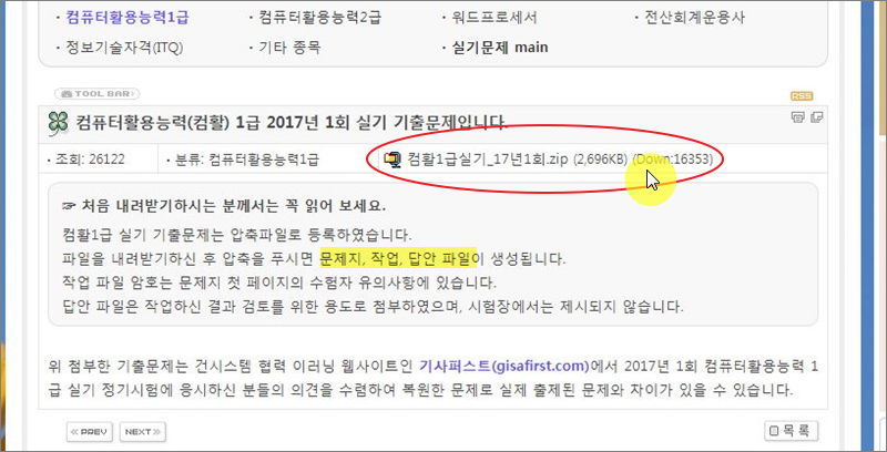 ▼ 풀어보고 싶은 실기 기출문제를 선택해 보았습니다. 자료가 압축된 상태로 첨부가 되어 있습니다. 해당 압축을 풀려면 알집이나 반디집 등의 압축 관련 프로그램을 사용하면 됩니다. 그럼 해당 정보를 잘 활용하시어 컴활1급 시험 준비를 알차게 하시길 바랍니다.