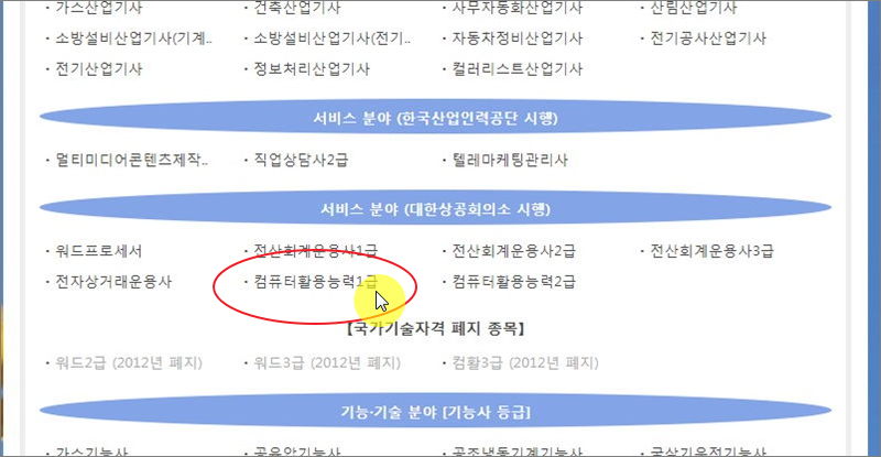 ▼ 필기시험 페이지를 보면 여러 가지 자격증 이름이 많이 나옵니다. 여기에서 컴퓨터활용능력1급을 클릭합니다.