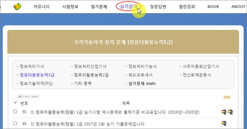 ▼ 메뉴에서 실기시험을 클릭하면 여러 회차로 구성된 컴퓨터활용능력 1급 실기 기출문제 게시판을 만나볼 수 있습니다.