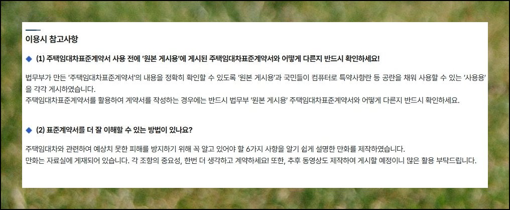 주택 부동산 임대차 표준 관련 화면이 나타나면 올바른 위치에 온 거예요. 사용용이라고 표기된 버튼을 누르면 곧장 hwp 포맷의 계약서가 컴퓨터에 저장됩니다.