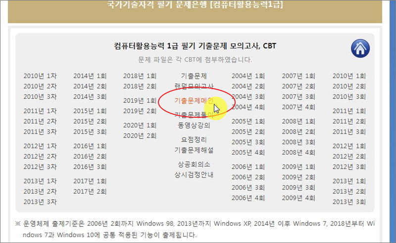 ▼ 컴활1급 필기 기출문제 모의고사 페이지가 나타났습니다. 2004년 1회부터 2020년 2회까지 상당량의 기출문제 자료가 있음을 확인할 수 있습니다. 화면 중앙에 있는 "기출문제메인"을 클릭해 봅니다.