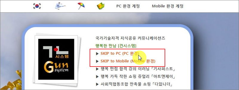 ▼ 건시스템 사이트의 경우 일반 컴퓨터 환경은 물론이고, 모바일 기기로 보기 좋은 환경으로 사용할 수 있습니다. 일반 PC로 접속하였다면 "SKIP to PC (PC 환경)"을 클릭하면 됩니다.