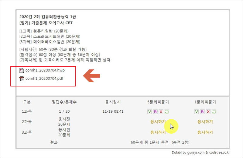 ▼ 건시스템의 경우 기출문제 자료를 2가지 방식으로 제공하고 있습니다. hwp 파일과 pdf 파일입니다. 아무래도 뷰어를 쉽게 얻을 수 있는 pdf 파일을 다운 받는 것이 좋습니다. 해당 페이지 화면을 보면 문제 풀기 서비스도 찾을 수 있습니다. 여기에서 응시하기를 누르면 온라인 상에서 컴활1급 문제를 풀 수 있습니다.